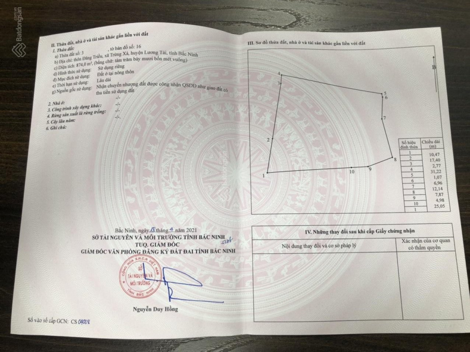 - Tổng diện tích 874m² full thổ cư, dọc đất là một hồ nước của thôn Trừng Xá, phong thủy rất đẹp, xung quanh đầy đủ tiện ích, dân cư đông, gần trường cấp 1.2.3, sát trạm y tế xã và UBND xã Trừng Xá.
