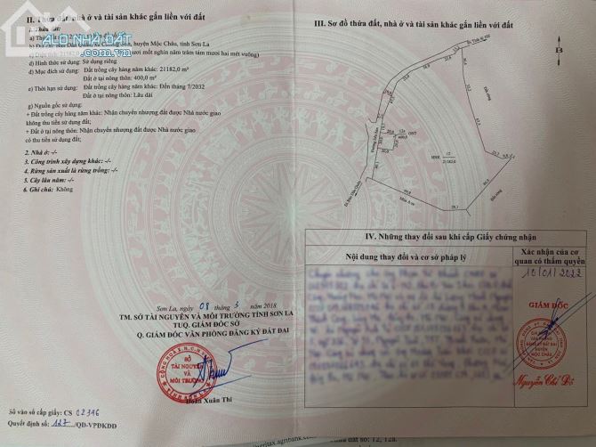 Vị trí tại xã Chiềng Sơn, Mộc Châu, Sơn La Tổng diện tích : 22000 m2 có hơn 400m2 thổ cư . Hiện trạng trên đất đã có nhà và vườn cây ăn quả với rất nhiều loại cây như: 750 cây bưởi da xanh 520 cây xoài 60 cây cam 40 cây chanh Hồng xiêm 150 cây Ngoài ra còn có 300 cây các loại khác Hiện trạng đã có nhà . đường oto . điện nước . khu dân cư . Thích hợp làm homestay. triển khai mô hình du lịch . … Xung quanh có dân làng hiện hữu,chợ, trường học… đầy đủ. gần bệnh viên,siêu thị. Khí hậu mát mẻ quanh năm. Giá bán: 5.4 tỷ Lô đất này có vị trí đắc địa, mặt tiền đường lớn, đông người qua lại, rất phù hợp để xây nhà Homestay. Liên hệ : 0965016648 ( MR TRÌNH) TƯ VẤN VÀ XEM NHÀ TRỰC TIẾP 24/7